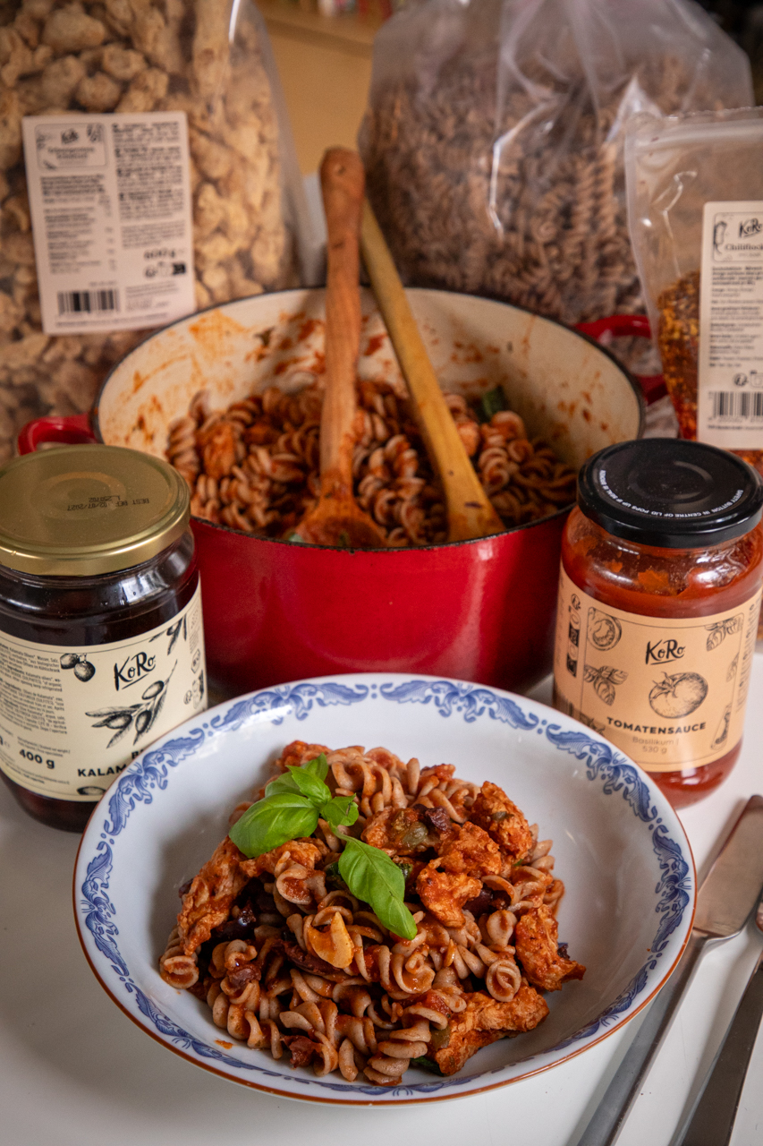 ” Puttanesca är en pastarätt som traditionellt görs på konservmat, perfekt för kristider och som här, på råvaror beställda online från Koro.se! ”